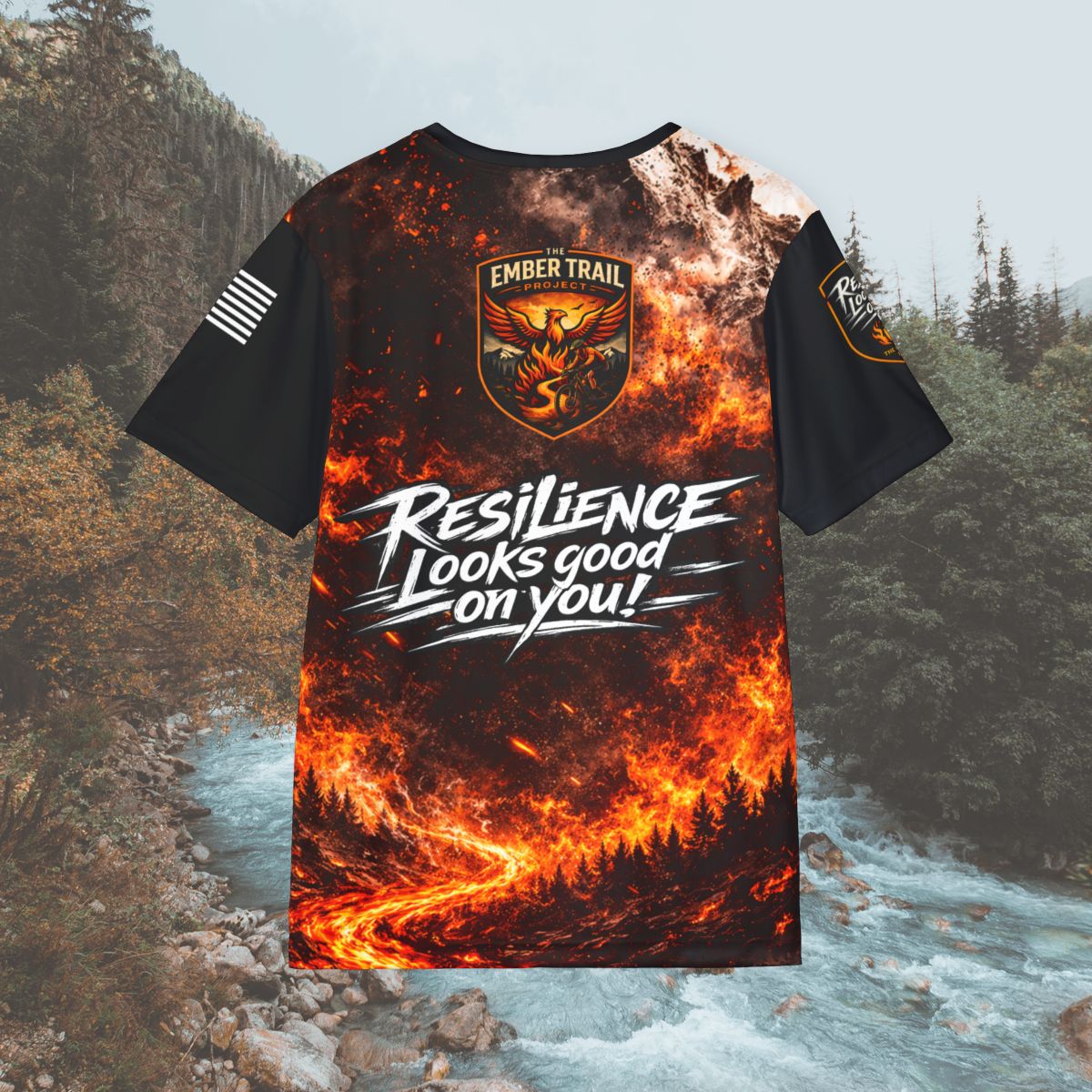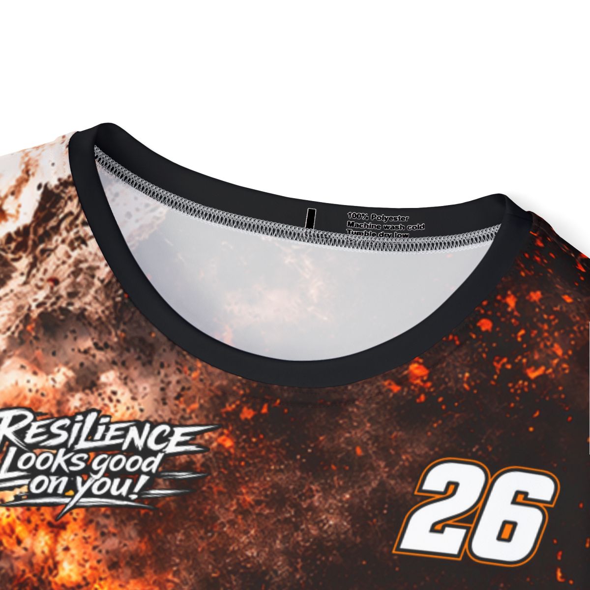 This Ember Trail sports jersey brings high-energy style and performance together. Lightweight, moisture-wicking polyester keeps you cool while bold, fire-swept graphics — a phoenix crest, smoldering trail and motivational lettering — broadcast grit and forward momentum. The 1x1 ribbed collar and armholes flex comfortably when you pull it on, then snap back for a clean, athletic silhouette. Colors stay vivid through repeated wear thanks to advanced all-over printing, while the classic fit and printed care label make daily use simple. Wear it for training runs, team events, obstacle races, or whenever you want to move with heat and purpose.